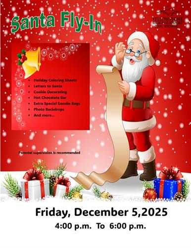 Come join in on the fun at Yellowstone Regional Airport's 4th annual Santa Fly-In. Santa, Mrs. Claus and their elves will be at the airport from 4:00 p.m. to 6:00 p.m. on Friday, December 5, 2025. There will be various photo backdrops available for your holiday photos and for the kiddos, there will be holiday coloring sheets, letters to Santa, cookie decorating, hot chocolate bar, extra special goodie bags and more. The best part of the event, of course, will be being able to visit with Santa. Hope to see you there.